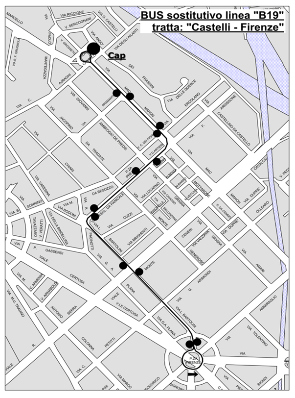 Tra piazza Firenze e piazza Castelli i tram sono sostituiti dal bus B19 - mappa